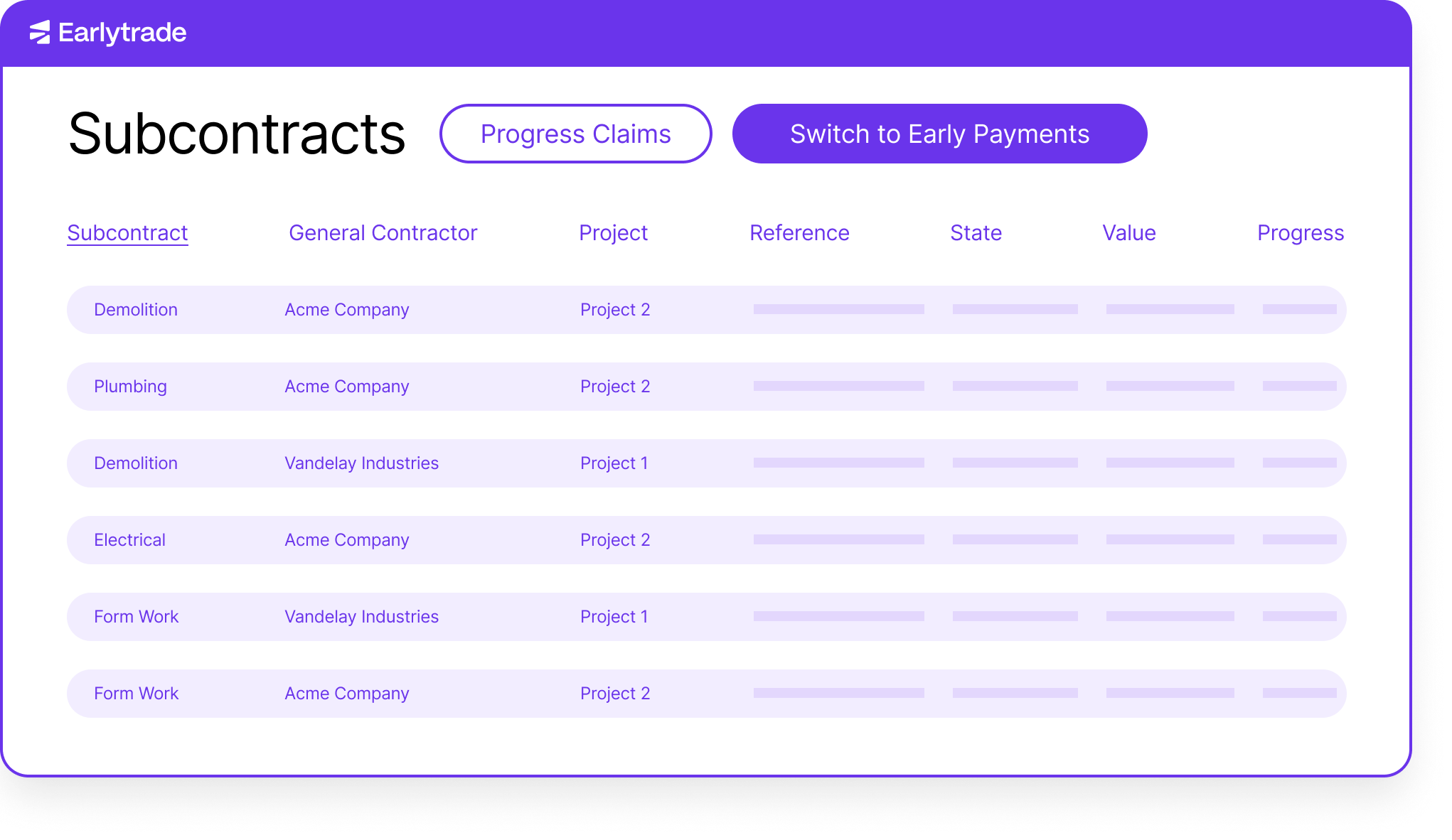Companies that launch Earlytrade value the relationships they have with subcontractors and suppliers. Earlytrade provides you visibility into approved invoices and estimated payment dates, and provides on-demand, debt-free access to working capital.